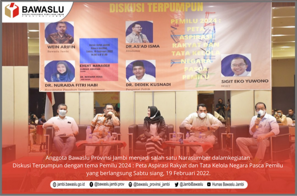 Jambi, Badan Pengawas Pemilihan Umum - Anggota Bawaslu Provinsi Jambi yang Kordiv Penanganan Pelanggaran Wein Arifin, S.IP., M.IP menjadi salah satu Narasumber dalam kegiatan Diskusi Terpumpun dengan tema Pemilu 2024: Peta Aspirasi Rakyat dan Tata Kelola Negara Pasca Pemilu yang berlangsung Sabtu Siang, 19 Februari 2022.