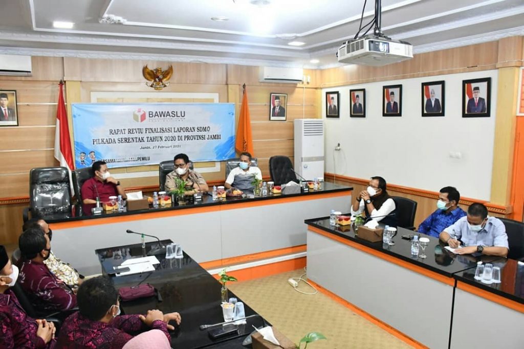 Jambi, Badan Pengawas Pemilihan Umum - Anggota Bawaslu RI Bapak Rahmat Bagja memberikan arahan dalam kegiatan Rapat Reviu Finalisasi Laporan SDM Pilkada Serentak Tahun 2020 di Provinsi Jambi Sabtu (27/2/2021) yang diikuti oleh Bawaslu Kabupaten/Kota di ruang rapat Bawaslu Provinsi Jambi. Tampak hadir Ketua dan Anggota Bawaslu Provinsi Jambi, Kepala Sekretariat, Para Kabag dan staf.