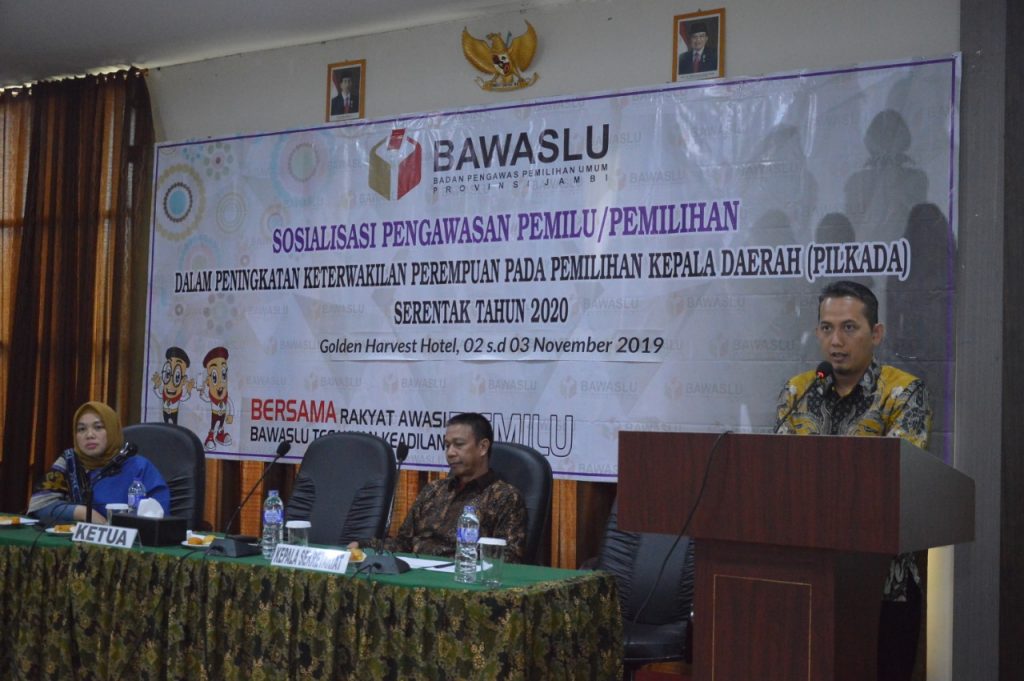 Jambi, Badan Pengawas Pemilihan Umum – Dalam rangka meningkatkan keterwakilan perempuan pada Pilkada serentak tahun 2020, Bawaslu Provinsi Jambi menggelar kegiatan sosialisasi pengawasan Pemilu/Pemilihan dalam rangka peningkatan keterwakilan perempuan pada Pilkada serentak tahun 2020, yang berlangsung selama 2 hari, mulai dari tanggal 2 s.d 3 November 2019.