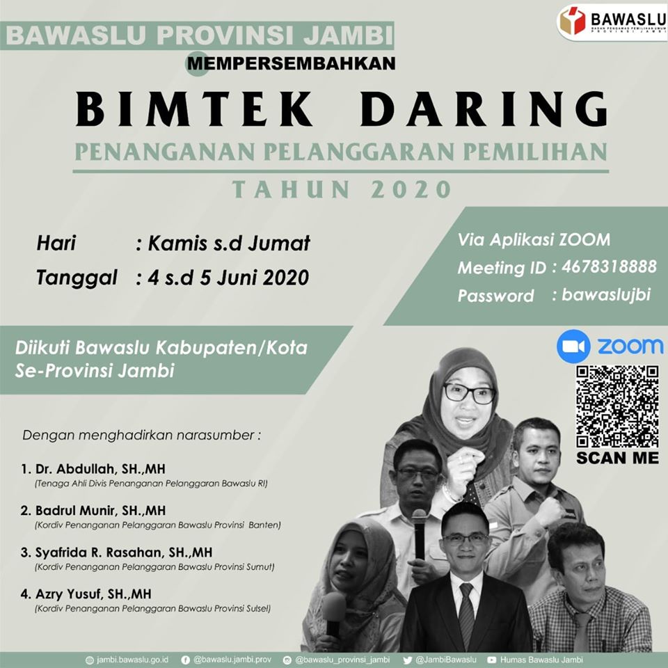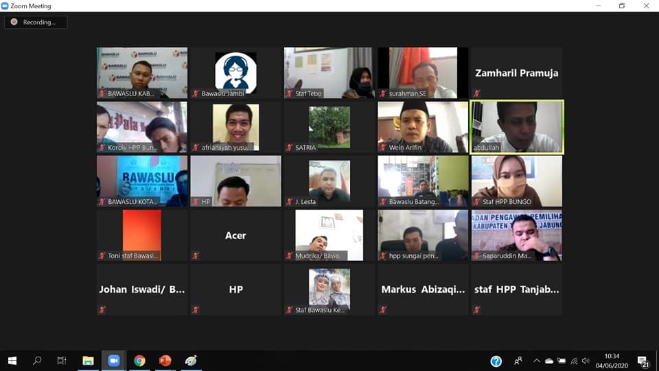 Jambi, Badan Pengawas Pemilihan Umum – Bawaslu Provinsi Jambi mengadakan kegiatan Bimtek Daring Penanganan Pelanggaran Pemilihan tahun 2020 yang berlangsung selama dua hari dari tanggal 4 s.d 5 Juni 2020.