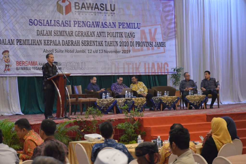 Jambi, Badan Pengawas Pemilihan Umum - Bawaslu Provinsi Jambi menggelar sosialisasi pengawasan Pemilu dalam seminar gerakan anti politik uang dalam Pemilihan Kepala Daerah (Pilkada) serentak 2020, Selasa (12/11).