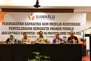 Bawaslu Gelar Simulasi Sidang Sengketa BAWASLUJAMBI-Dalam rangka peningkatan kapasitas SDM majelis adjudikasi Penyelesaian sengketa proses Pemilu. Bawaslu Provinsi Jambi menggelar kegiatan pelatihan bagi Bawaslu Kabupaten/Kota se-Provinsi Jambi tahun 2019, untuk menghadapi sidang penyelesaian sengketa proses Pemilu mendatang. “Dengan kegiatan ini diharapkan dapat meningkatkan kemampuan dan pemahaman akan proses sidang adjudikasi penyelesaian sengketa proses Pemilu bagi jajaran Bawaslu,” ujar Anggota Bawaslu Provinsi Jambi Afrizal, S.Pd,I MH Minggu (31/3). Dalam kegiatan ini menghadirkan narasumber Anggota Bawaslu Republik Indonesia Rahmat Bagja, akademisi, serta Ketua dan Anggota Bawaslu Provinsi Jambi. Selain itu, juga dilakukan simulasi adjudikasi penyelesaian sengketa proses Pemilu, untuk mengetahui proses dan mekanis sidang  yang akan dihadapi oleh jajaran Bawaslu kabupaten/kota. “Mudah-mudahan ilmu dan materi yang didapatkan dalam kegiatan tersebut, dapat diimplementasikan di tingkat kabupaten/kota,” harapnya. Sementara itu, dalam materi sekaligus memberikan arahan kepada jajaran Bawaslu Kabupaten/Kota se-Provinsi Jambi, Anggota Bawaslu Republik Indonesia Rahmat Bagja mengajak jajaran Bawaslu untuk tetap menjaga solidaritas, integritas, mandiri dan profesional dalam menjalankan tugas. “kekompakan dan ketegasan dalam melakukan aktifitas pengawasan harus sesuai dengan aturan dan mekanis yang Bawaslu miliki, jangan sampai merugikan nama baik lembaga,” pintanya. (*) SUMBER : HUMAS BAWASLU PROVINSI JAMBI