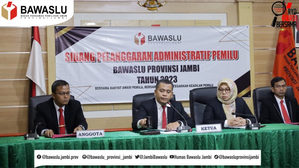 Sidang dengan Nomor Perkara 001/TM/ADM.PL/BWSL.PROV/05.00/I/2023 ini berlangsung di ruangan sidang Bawaslu Provinsi Jambi, Kamis, 16 Februari 2023 dengan Ketua Majelis Sidang Wein Arifin dan Anggota Fahrul Rozi, Rofiqoh Pebrianti dan Muhammad Hapis.