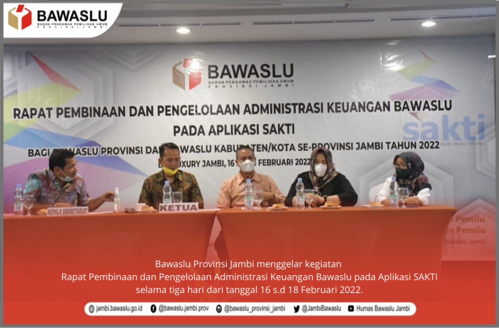 Jambi, Badan Pengawas Pemilihan Umum - Bawaslu Provinsi Jambi menggelar kegiatan Rapat Pembinaan dan Pengelolaan Administrasi Keuangan Bawaslu pada Aplikasi SAKTI selama tiga hari dari tanggal 16 s.d 18 Februari 2022 yang diikuti oleh Bawaslu Kabupaten/Kota se-Provinsi Jambi. Tampak hadir Ketua Bawaslu Provinsi Jambi Asnawi R, M.Pd didampingi Kepala Sekretariat dan Para Kabag saat pembukaan acara.
