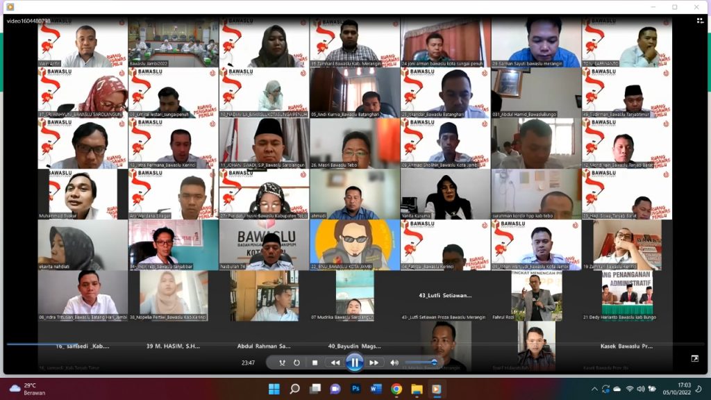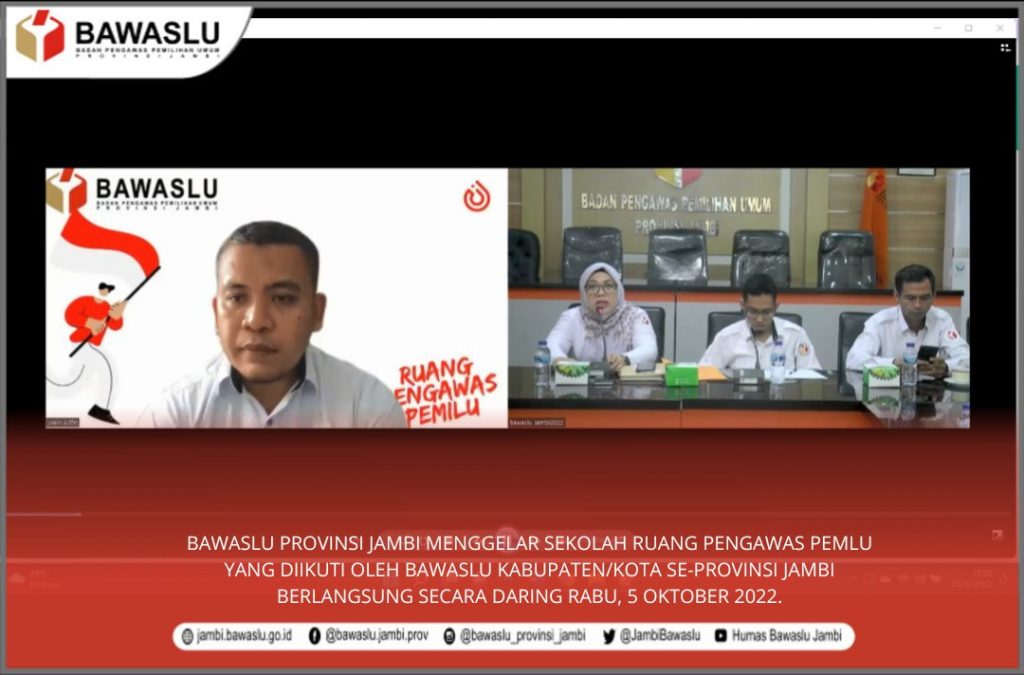Jambi, Badan Pengawas Pemilihan Umum - Bawaslu Provinsi Jambi Rabu (05/10/2022), gelar kegiatan Sekolah Ruang Pengawas Pemilu sebagai bentuk persiapan menjelang Pemilu tahun 2024. Kegiatan ini dilaksanakan secara berkelanjutan dengan pembahasan yang berhubungan dengan Pemilihan Umum, sebagai bentuk upaya peningkatan pengetahuan kepemiluan bagi pengawas Pemilu, yang berlangsung daring.