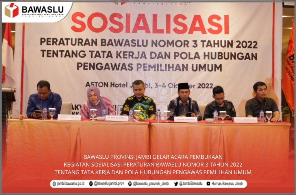 Bawaslu Provinsi Jambi menggelar acara pembukaan Sosialisasi Peraturan Bawaslu Nomor 3 Tahun 2022 tentang Tata Kerja dan Pola Hubungan Pengawas Pemilihan Umum yang diikuti oleh Bawaslu Kabupaten/Kota berlangsung pada hari Senin, 3 Oktober 2022. Tampak hadir Ketua dan Anggota Bawaslu Provinsi Jambi, Kepala Sekretariat Bawaslu Provinsi Jambi dan Para Kabag dilingkungan Bawaslu Provinsi Jambi.