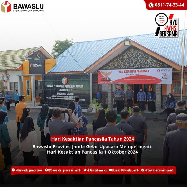 Jambi, Badan Pengawas Pemilihan Umum – Bawaslu Provinsi Jambi menggelar Upacara Memperingati Hari Kesaktian Pancasila 1 Oktober 2024. Bersama Pancasila Kita Wujudkan Indonesia Emas. Yang berlangsung di Halaman Kantor Bawaslu Provinsi Jambi, bertindak sebagai Inspektur Upacara Ketua Bawaslu Provinsi Jambi Wein Arifin. Hadir juga Anggota Bawaslu Provinsi Jambi Ari Juniarman dan Indra Tritusian, Plt. Kepala Sekretariat Yanita Kusuma, Kabag Penanganan Pelanggaran Penyelesaian Sengketa Proses dan Hukum Shella Novelina serta jajaran Sekretariat Bawaslu Provinsi Jambi. (*)