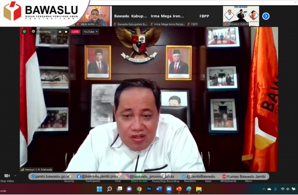 Dengan menghadirkan narasumber Dr. Herwyn Jefler Hielsa Malonda, M.Pd., MH (Anggota Bawaslu RI), Wein Arifin (Ketua Bawaslu Provinsi Jambi) dan Ocit/Abdurrosyid Siddiq (Anggota Bawaslu Provinsi Banten) di pandu oleh Moderator Supriadi.