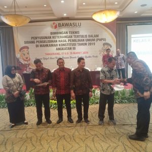 BAWASLUJAMBI-Ketua dan Anggota Bawaslu Provinsi Jambi mengikuti kegiatan Bimbingan Teknis Penyusunan Keterangan Tertulis Dalam Sidang Perselisihan Hasil Pemilihan Umum (Pemilu) di Mahkamah Konstitusi Tahun 2019 Angkatan III yang dilaksanakan oleh Bawaslu RI di Tangerang dari tanggal 17-19 Maret 2019.