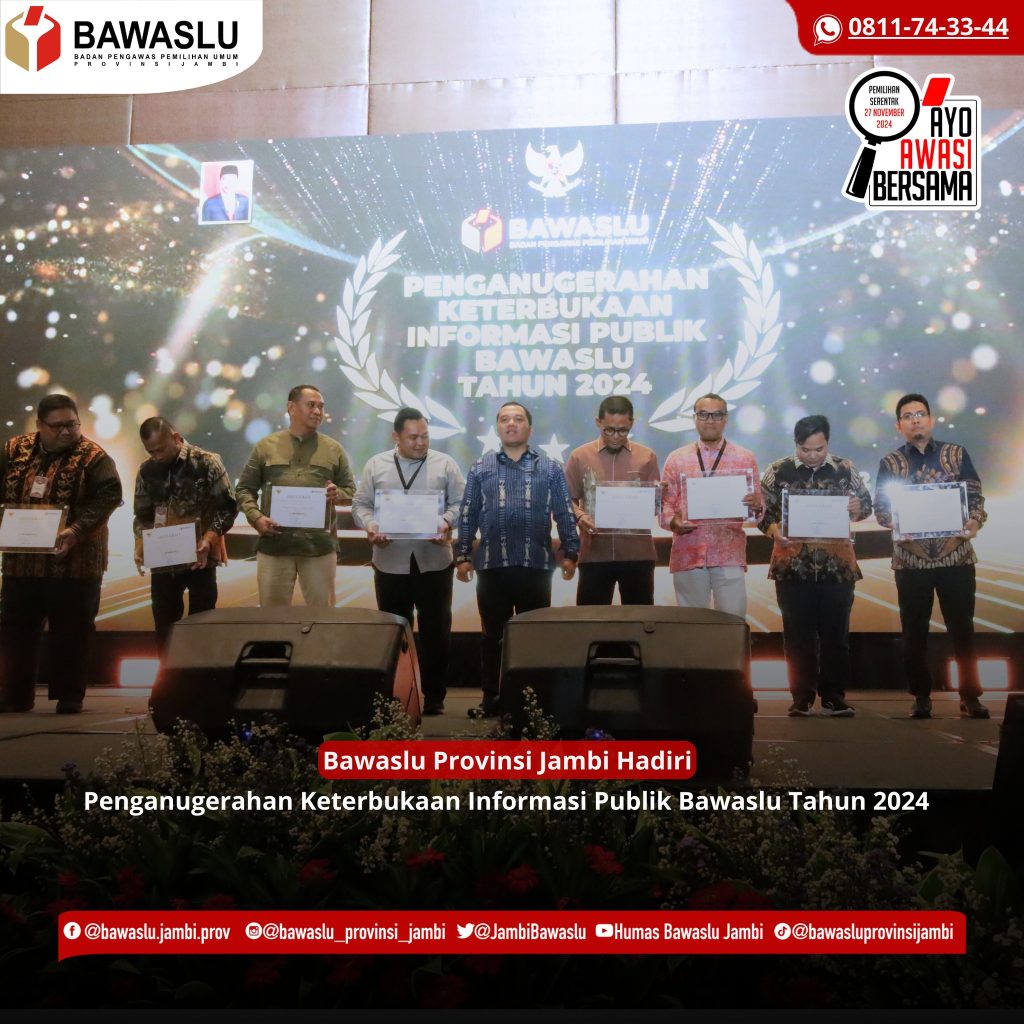 Jambi, Badan Pengawas Pemilihan Umum - Anggota Bawaslu Provinsi Jambi Ari Juniarman didampingi Plt. Kepala Sekretariat Yanita Kusuma menghadiri Penganugerahan Keterbukaan Informasi Publik Bawaslu Tahun 2024 pada kegiatan Rakornas Data dan Informasi Bawaslu Tahun 2024 yang berlangsung di Tangerang Banten. Dalam penganugerahan, Bawaslu Provinsi Jambi meraih predikat informatif.