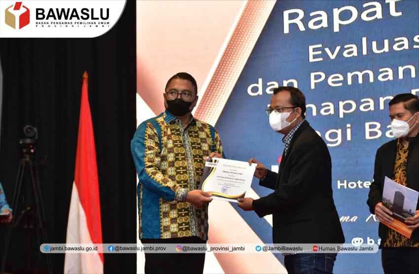Jambi, Badan Pengawas Pemilihan Umum – Dalam kegiatan Rapat Koordinasi Nasional (Rakornas) Evaluasi Program Kerja Tahun 2021 dan Pemantapan Persiapan Pengawasan Tahapan Pemilu Serentak 2024, di Jakarta selama tiga hari sejak tanggal 11 s.d 13 Desember 2021. Bawaslu Republik Indonesia memberikan sejumlah penghargaan kepada sejumlah Bawaslu Provinsi, salah satunya diberikan kepada Bawaslu Provinsi Jambi.