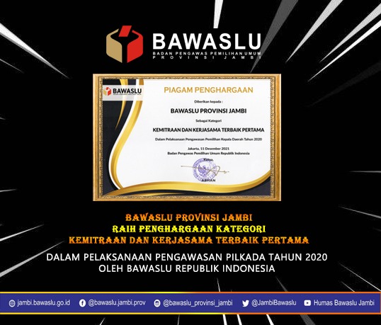 Menurut Anggota Bawaslu Provinsi Jambi yang juga Kordiv Pengawasan dan Hubal Fahrul Rozi, S.Sos mengatakan bahwa Bawaslu Provinsi Jambi meraih penghargaan kategori kemitraan dan Kerjasama terbaik pertama, dalam pelaksanaan Pilkada tahun 2020 oleh Bawaslu RI. “Ya, kemarin waktu kegiatan Rakornas Bawaslu Provinsi Jambi mendapatkan penghargaan kategori kemitraan dan Kerjasama terbaik pertama, dalam pelaksanaan Pilkada tahun 2020 oleh Bawaslu RI,” ujarnya, Kamis (14/12/2021).