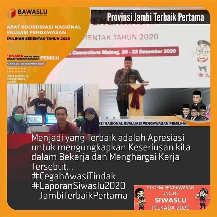 Apresiasi dan penghargaan ini atas berkat kerjasama jajaran pengawasan baik itu Bawaslu Provinsi maupun Bawaslu Kabupaten/Kota, Panwas Kecamatan, Panwas Desa/Kelurahan dan Pengawas TPS se-Provinsi Jambi yang Sudah bekerja keras dalam melaksanakan tugas pengawasan, dan secara sigap melaporkan hasil pengawasan melalui aplikasi Siwaslu.