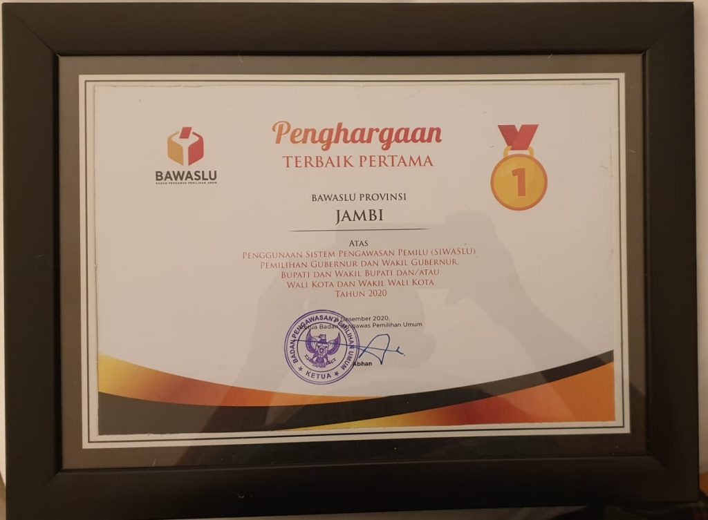 Jambi, Badan Pengawas Pemilihan Umum - Bawaslu Provinsi Jambi mendapatkan apresiasi terbaik pertama seluruh Indonesia dalam pelaporan penggunaan Sistem Pengawasan Pemilu (Siwaslu) oleh Bawaslu RI.