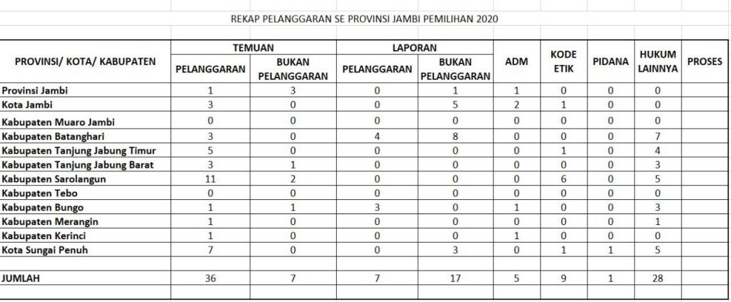 Dari ke-43 temuan pelanggaran Pilkada serentak di Provinsi Jambi itu ada beberapa kasus yang terdiri atas lima kasus pelanggaran administrasi, sembilan kasus kode etik, satu kasus pidana dan 28 kasus hukum lainnya diantaranya dugaan netralitas Aparatur Sipil Negara (ASN).