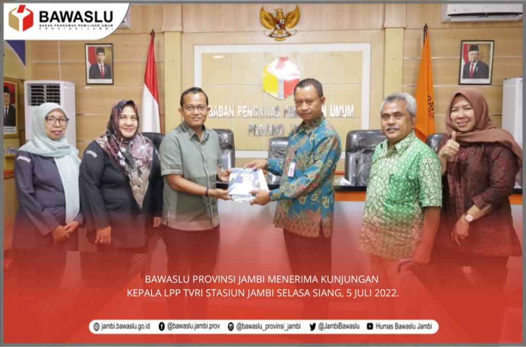 Anggota Bawaslu Provinsi Jambi Fahrul Rozi, S.Sos didampingi Kepala Sekretariat Bawaslu Provinsi Jambi Nasuhaidi, S.Pd., S.Sos., M.Si dan Para Kabag dilingkungan Bawaslu Provinsi Jambi menerima kunjungan Kepala LPP TVRI Stasiun Jambi Raden Sarjono beserta rombongan di Kantor Bawaslu Provinsi Jambi Selasa Siang, 5 Juli 2022.