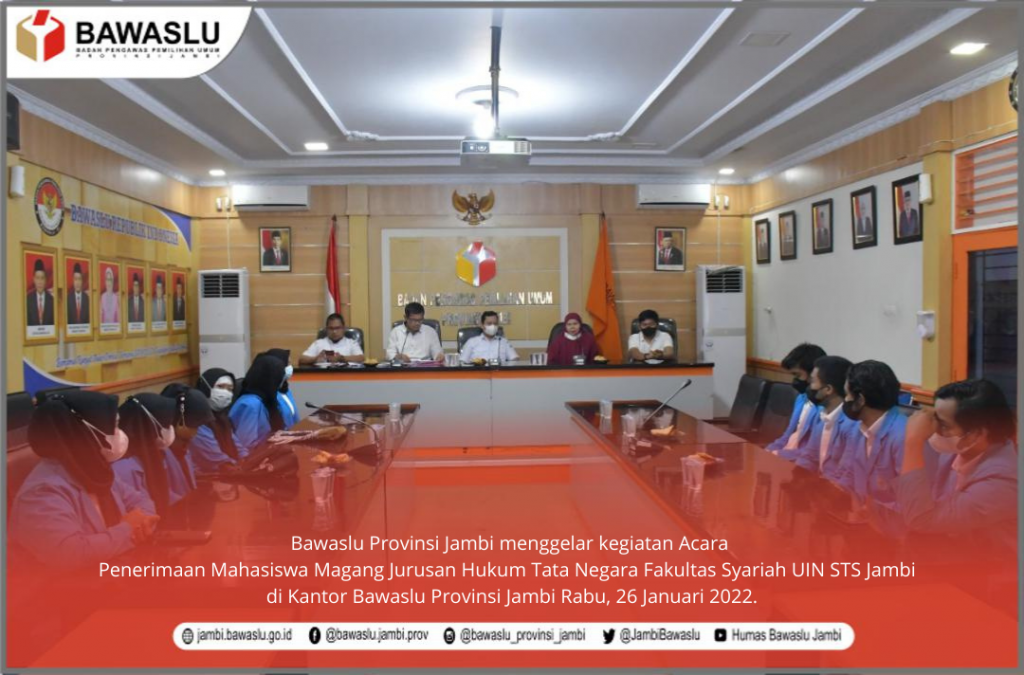 Jambi, Badan Pengawas Pemilihan Umum - Bawaslu Provinsi Jambi menerima kembali Mahasiswa dari Jurusan Hukum Tata Negara Fakultas Syariah UIN STS Jambi, untuk melakukan praktek kerja lapangan atau yang sering disebut magang. Penyerahan mahasiswa magang ini berlangsung di Kantor Bawaslu Provinsi Jambi Rabu, 26 Januari 2022.