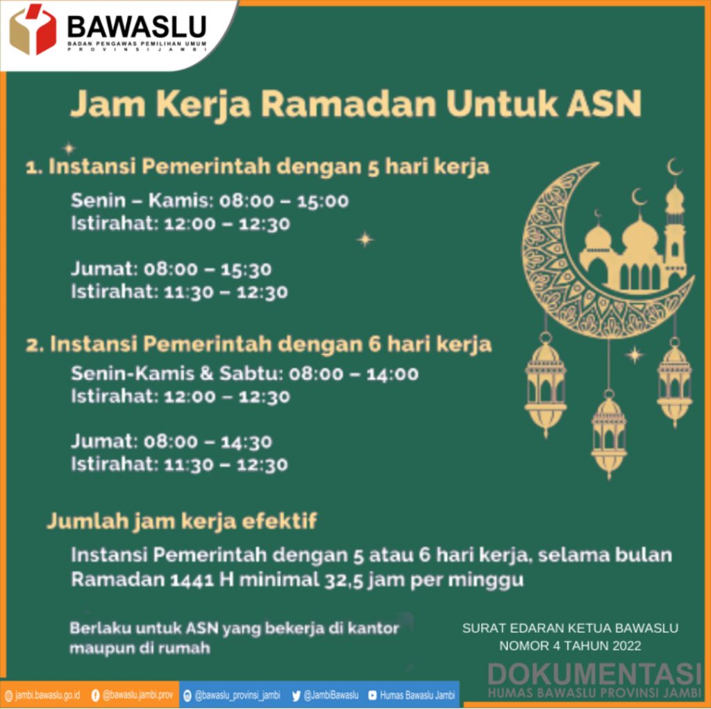 Jambi, Badan Pengawas Pemilihan Umum - Memasuki bulan Ramadan 1443 H, pemerintah telah mengatur jam kerja bagi para Aparatur Sipil Negara (ASN), TNI, dan Polri yang bekerja di kantor maupun di rumah. Hal tersebut tercantum dalam Surat Edaran Ketua Bawaslu Nomor 4 Tahun 2022 tentang Penetapan Jam Kerja Pada Bulan Ramadhan 1443 Hijriah Bagi Pegawai Di Lingkungan Bawaslu, Bawaslu/Panwaslih Provinsi, dan Bawaslu/Panwaslih Kabupaten/Kota, sebagai tindak lanjut dari Surat Edaran Menteri Pendayagunaan Aparatur Negara dan Reformasi Birokrasi Nomor 11 Tahun 2022 tentang Jam Kerja pada Bulan Ramadhan 1443 Hijriah di Lingkungan Instansi Pemerintah.