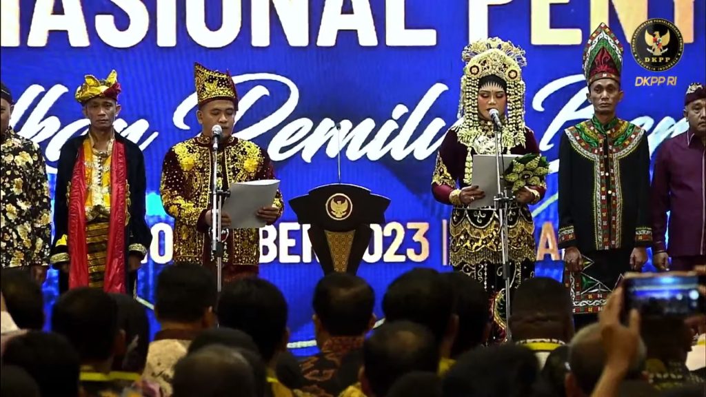 Berpakaian Khas Jambi, Bacakan Deklarasi Pemilu Berintegritas Dihadapan Presiden