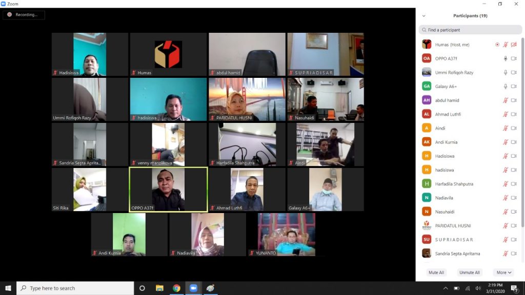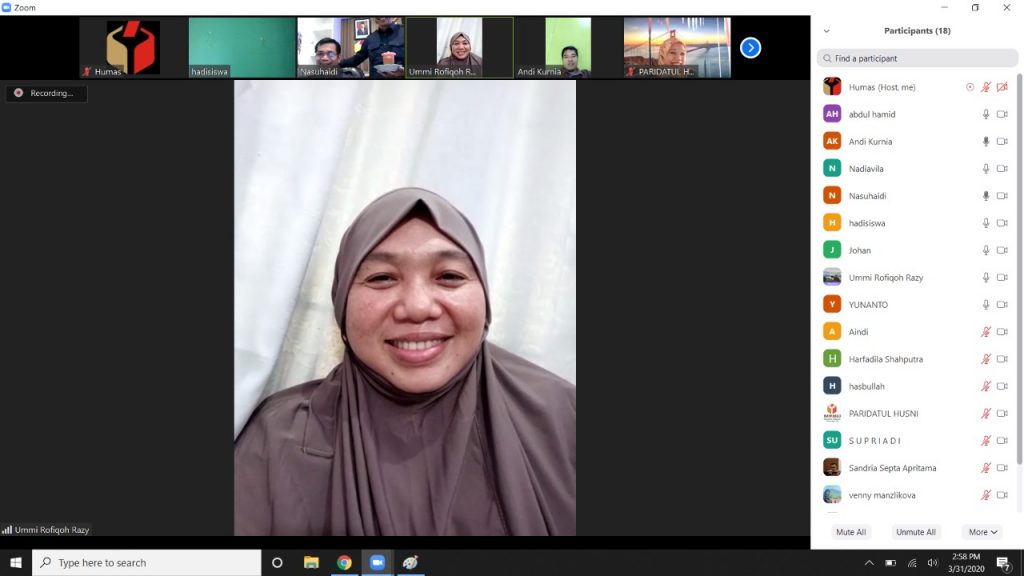 Jambi, Badan Pengawas Pemilihan Umum – Menindaklanjuti Surat Edaran (SE) Bawaslu RI Nomor 0252/K.Bawaslu/PM.00.00/3/2020 tentang Pengawasan Penundaan Tahapan Penyelenggaraan Pemilihan Gubernur dan Wakil Gubernur, Bupati dan Wakil Bupati, serta Walikota dan Wakil Walikota Tahun 2020 Dalam Upaya Pencegahan Penyebaran Covid-19, Kordiv SDM dan Organisasi yang juga Anggota Bawaslu Provinsi Jambi Rofiqoh Pebrianti, SP menggelar Rakor secara online dengan jajaran Bawaslu Kabupaten/Kota se-Provinsi Jambi, Selasa siang (31/3).