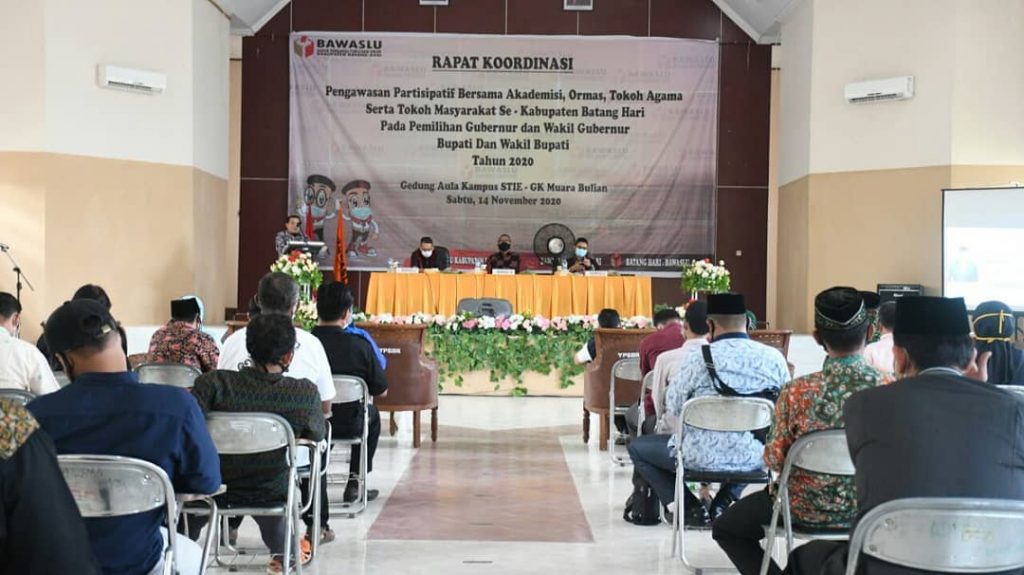 Jambi, Badan Pengawas Pemilihan Umum – Dalam kegiatan Rapat Koordinasi Pengawasan Partisipatif Bersama Akademisi, Ormas, Tokoh Agama serta Tokoh Masyarakat se-Kabupaten Batanghari pada Pemilihan serentak tahun 2020, yang berlangsung di aula Kampous STIE GK Muara Bulian Sabtu siang (14/11/2020). Anggota Bawaslu RI Fritz Edward Siregar mengajak masyarakat di Bumi Serentak Bak Regam, untuk ikut Bersama Bawaslu melakukan tugas pengawasan.