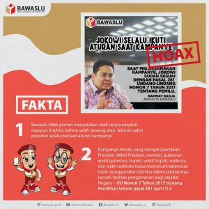 BAWASLUJAMBI – Bawaslu membantah telah membuat dan menyebarluaskan meme berisi “JOKOWI SELALU IKUTI ATURAN SAAT KAMPANYE”. Meme tersebut merupakan hoaks atau berita bohong yang dapat mendiskreditkan Bawaslu. Bawaslu tidak pernah menyatakan bahwa salah seorang atau seluruh peserta pemilu selalu menaati aturan kampanye.