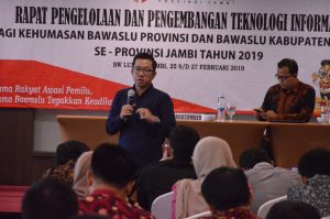 BAWASLUJAMBI-Hubungan Masyarakat atau yang sering disebut juga Humas, menjadi garda atau bagian terdepan dalam sebuah instansi pemerintah. Untuk memperkuat dan meningkatkan peranan Humas, Bawaslu Provinsi Jambi menggelar kegiatan rapat pengelolan dan pengembangan teknologi informasi bagi kehumasan Bawaslu Provinsi dan Bawaslu Kabupaten/Kota se-Provinsi Jambi, selama tiga hari dari tanggal 25 sampai 27 Februari 2019.