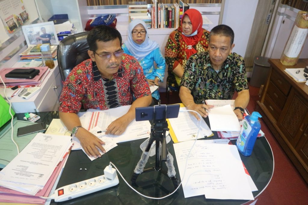 Tak lama kemudian, Kepala Sekretariat Bawaslu Provinsi Jambi didampingi para Kabag mengikuti Video Conference dengan Bawaslu RI melalui salah satu aplikasi.