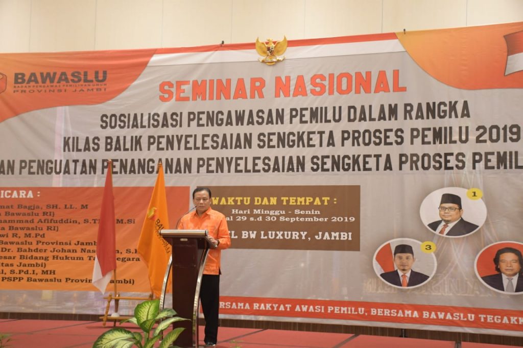 Hal itu dia ungkapkan oleh saat membuka seminar nasional Sosialisasi Pengawasan Pemilu Dalam Rangka Kilas Balik Penyelesaian Sengketa Pemilu 2019 dan Penguatan Penanganan Penyelesaian Sengketa Proses Pemilihan 2020 di Jambi, Minggu (29/9/2019).