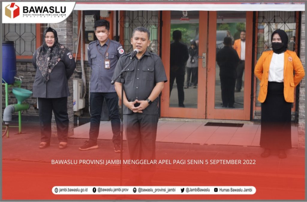 Bawaslu Provinsi Jambi menggelar Apel Pagi, Bertindak sebagai Pembina Apel Ketua Bawaslu Provinsi Jambi Wein Arifin, S.IP., M.IP diikuti oleh jajaran sekretariat Bawaslu Provinsi Jambi berlangsung di halaman Kantor Bawaslu Provinsi Jambi Senin, 5 September 2022. Tampak hadir Para Kabag di Lingkungan Bawaslu Provinsi Jambi.