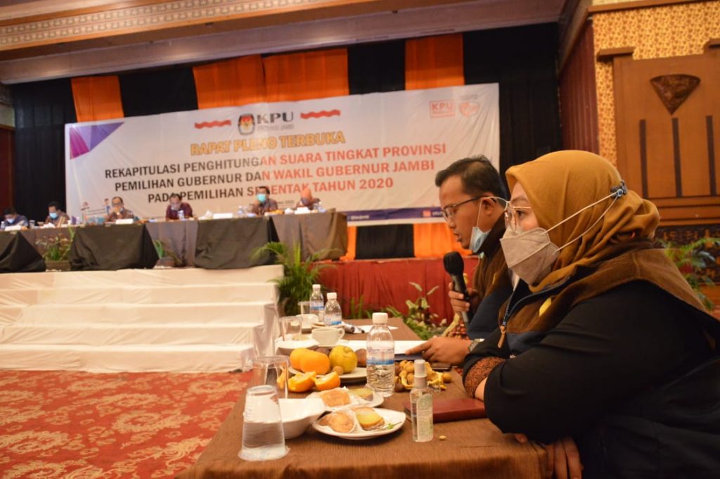 Jambi, Badan Pengawas Pemilihan Umum – Dalam pelaksanaan rapat Pleno Terbuka Rekapitulasi PRekapitulasi Penghitungan Suara Tingkat Provinsi dalam Pemilihan Gubernur dan Wakil Gubernur Jambi pada Pemilihan Serentak Tahun 2020 yang berlangsung di Abadi Suite Kota Jambi, selama dua hari dari Jumat (18/12/2020) hingga Sabtu (19/12/2020).