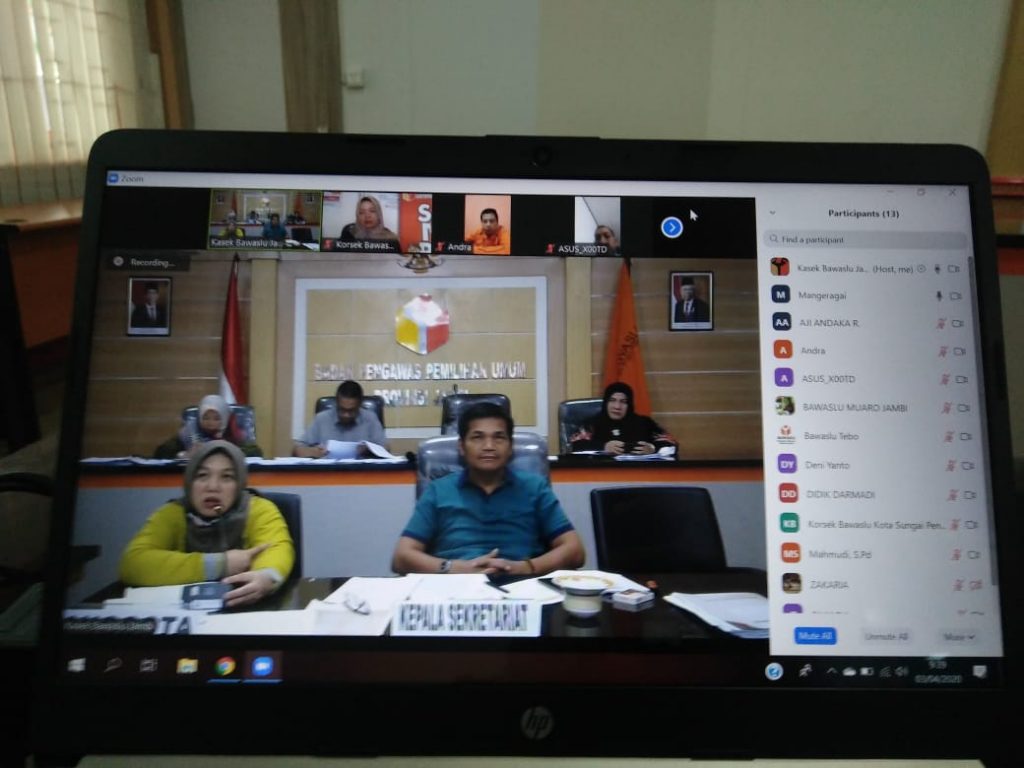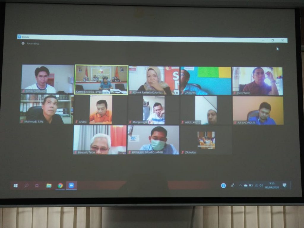 Jambi, Badan Pengawas Pemilihan Umum –Kepala Sekretariat (Kasek) Bawaslu Provinsi Jambi Nasuhaidi kembali melakukan Video Conference (Vidcon), dalam rangka melakukan rapat koordinasi sekaligus berdiskusi secara virtual atau secara online bersama Koordinator Sekretariat (Korsek) Bawaslu Kabupaten/Kota se-Provinsi Jambi, yang berlangsung di Jumat pagi (3/4), yang didampingi oleh para Kabag dan Kasubbag.