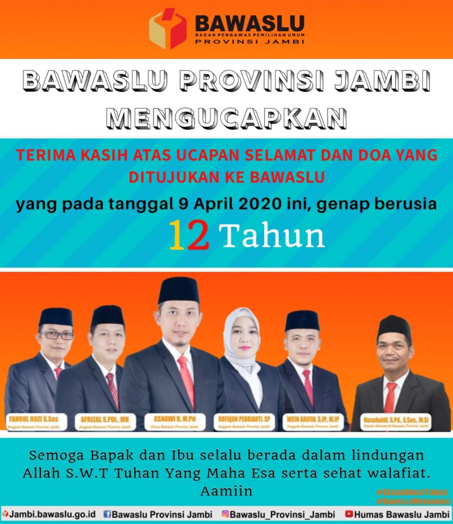 Jambi, Badan Pengawas Pemilihan Umum – Tepat 9 April 2020, Bawaslu genap berusia 12. Khususnya di Bawaslu Provinsi Jambi, Bawaslu banjir ucapan. Badan Pengawas Pemilihan Umum ini, paling tidak menerima belasan video ucapan yang disampaikan oleh sejumlah pejabat dan tokoh.