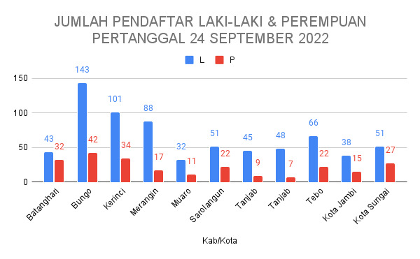 Hasil pemantauan Bawaslu Provinsi Jambi tersebut sebagaimana disampaikan oleh Anggota Bawaslu Provinsi Provinsi Jambi selaku Koordinator Divisi Sumber Daya Manusia, Organisasi, Pendidikan dan Pelatihan Rofiqoh Pebrianti, SP, yang diperoleh dari Bawaslu Kabupaten/Kota se-Provinsi Jambi per tanggal 24 September 2022. Update jumlah pendaftar yang menyerahkan berkasnya di masing-masing Bawaslu Kabupaten/Kota di wilayah Provinsi Jambi dengan rincian pada tabel berikut: