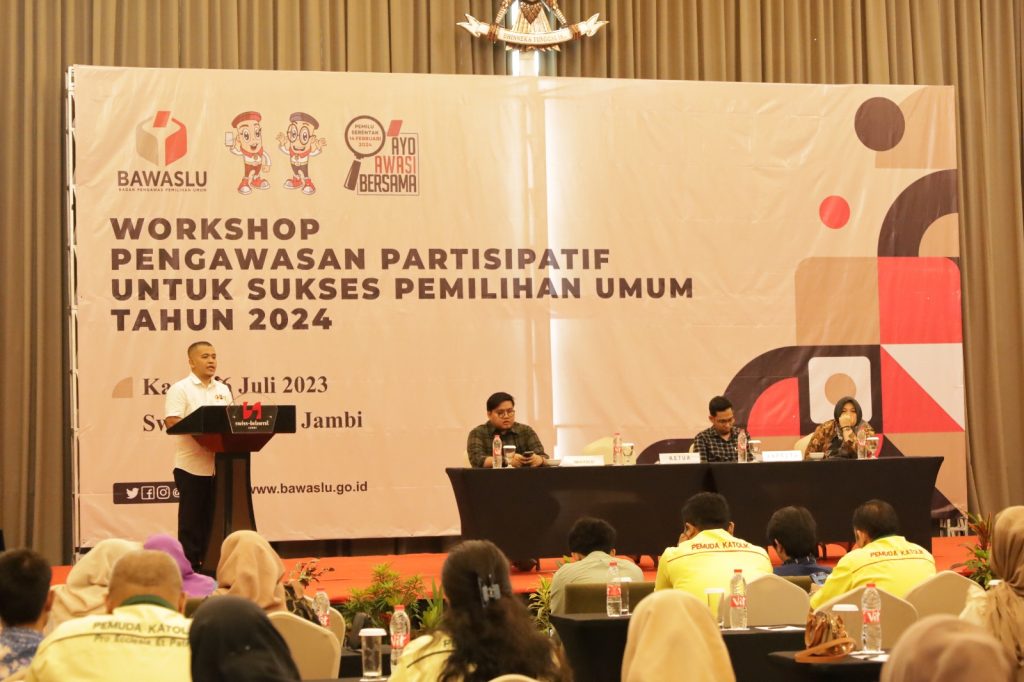 Ketua Bawaslu Provinsi Jambi Wein Arifin, S.IP., M.IP mengajak Masyarakat Berkolaborasi dengan Bawaslu dalam melakukan Pengawasan. Hal ini disampaikan saat membuka Workshop Pengawasan Partisipatif untuk Sukses Pemilu tahun 2024 yang diselenggarakan oleh Bawaslu RI di Kota Jambi Kamis, 6 Juli 2023. Tampak hadir Anggota Bawaslu Provinsi Jambi Rofiqoh Pebrianti, S.P dan Ari Juniarman, S.H., M.H, perwakilan Bawaslu RI, Kabag Pengawasan dan Humas Yanita Kusuma, S.H., M.H dan undangan lainnya dengan narasumber Ray Rangkuti (Lingkar Madani) dan Aji Pengestu (JPPR).