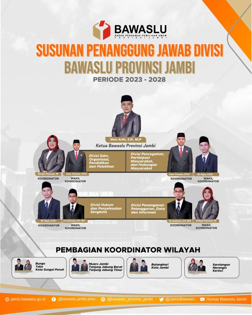Dalam rapat pleno tersebut, Wein Arifin kembali dipilih menjadi Ketua Bawaslu Provinsi Jambi, dengan pembagian Koordinator Divisi dan Wakil Koordinator Divisi, sebagai berikut :
