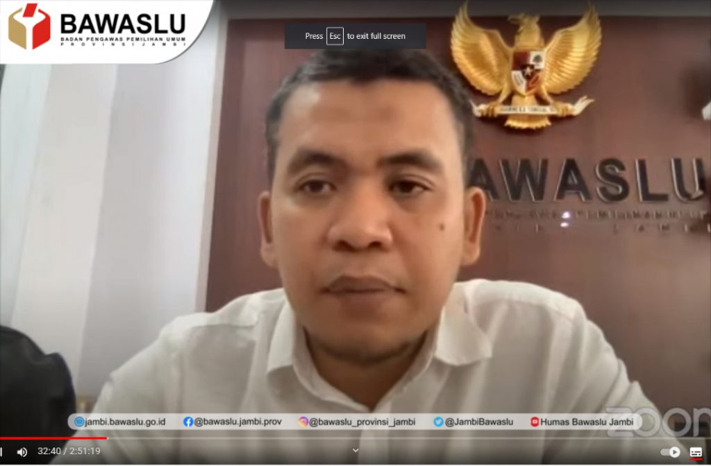 Dalam kegiatan webinar ini menghadirkan narasumber Anggota Bawaslu Provinsi Jambi yang juga Kordiv Penyelesaian Sengketa Afrizal, S.Pd.I., M.H, Prof. Dr. Elita Rahmi, S.H., M.Hum Guru Besar Fakultas Hukum Unja, dan Koordinator Nasional JPPR, Nurlia Dian Paramita dipandu oleh Agus KBS serta diikuti oleh Ketua dan Anggota Bawaslu Provinsi Jambi beserta Kabag, Pejabat Fungsional, Bawaslu Kabupaten/Kota dan jajaran sekretariat Bawaslu Provinsi maupun Kabupaten/Kota. (*)