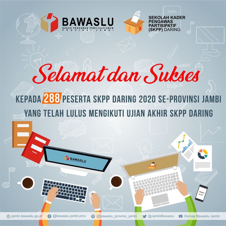 Jambi, Badan Pengawas Pemilihan Umum – Setelah melewati proses panjang tahapan pelaksanaan SKPP Daring tahun 2020, sebanyak 288 peserta dinyatakan lulus mengikuti ujian akhir dari tahapan Sekolah Kader Pengawas Partisipatif (SKPP) Daring yang dilaksanakan secara online atau virtual.
