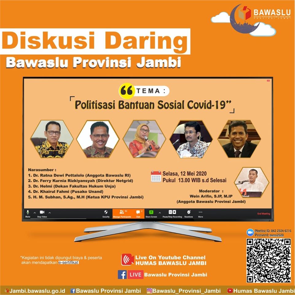 Dikatakannya, bahwa bBahaya Covid-19 yang penularannya begitu cepat memaksa pemerintah harus kerja ekstra keras mengendalikan dan melindungi warga negara. Bantuan Sosial (Bansos) pun dicanangkan sebagai wujud tanggung jawab negara. “Hal ini yang harus dan patut kita awasi dan waspadai, jangan sampai dana Bansos yang merupakan uang rakyat dimanfaatkan oleh pihak yang berkepentingan dalam menatap Pilkada nanti, dan melihat ancaman konflik kepentingan tersebut, Bawaslu Provinsi Jambi akan mengupas tuntas "Politisasi Bansos Covid-19" bersama narasumber yang ahli dibidangnya,” katanya.