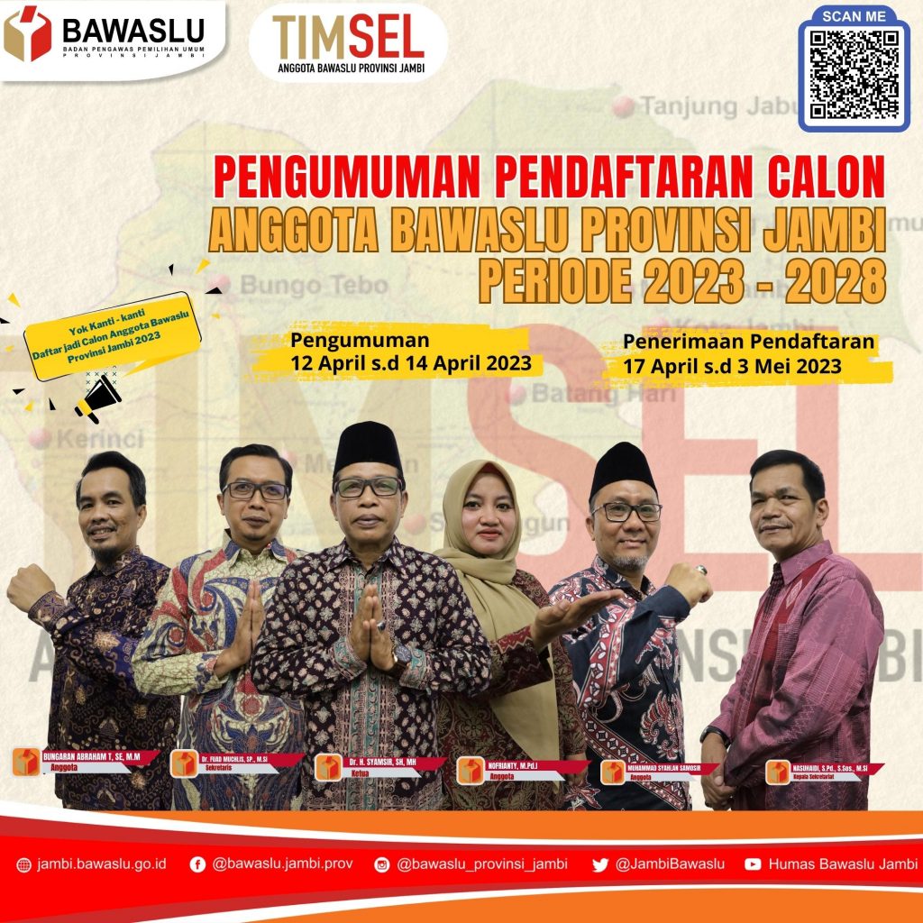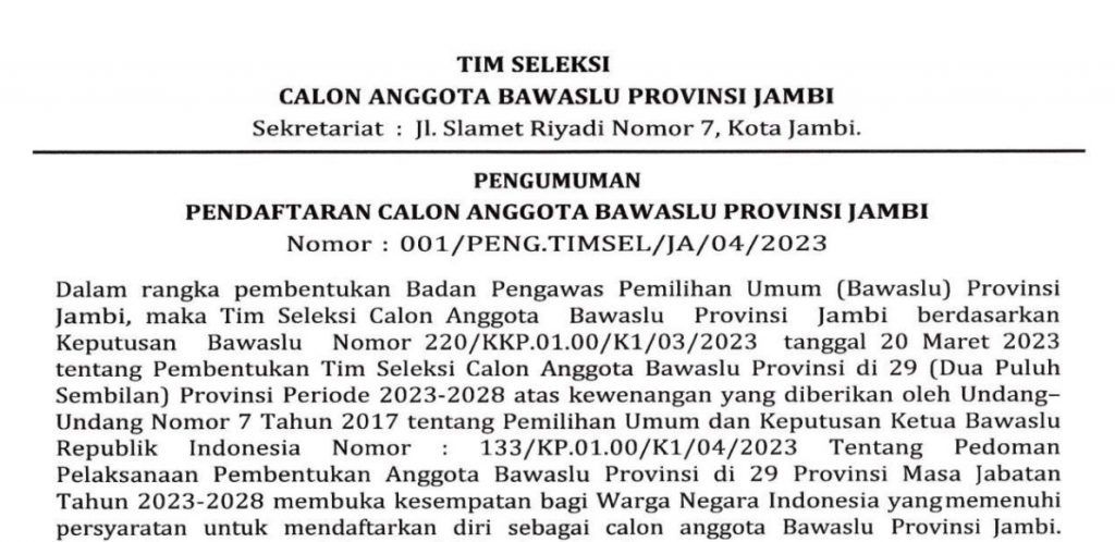 Badan Pengawas Pemilihan Umum (Bawaslu) secara resmi telah membuka rekrutmen pendaftaran anggota tingkat provinsi. Pendaftaraan calon anggota Bawaslu tingkat provinsi tahun 2023-2028 itu dibuka mulai Senin (17/4/2023) hingga Rabu (3/5/2023), termasuk untuk Bawaslu Provinsi Jambi.