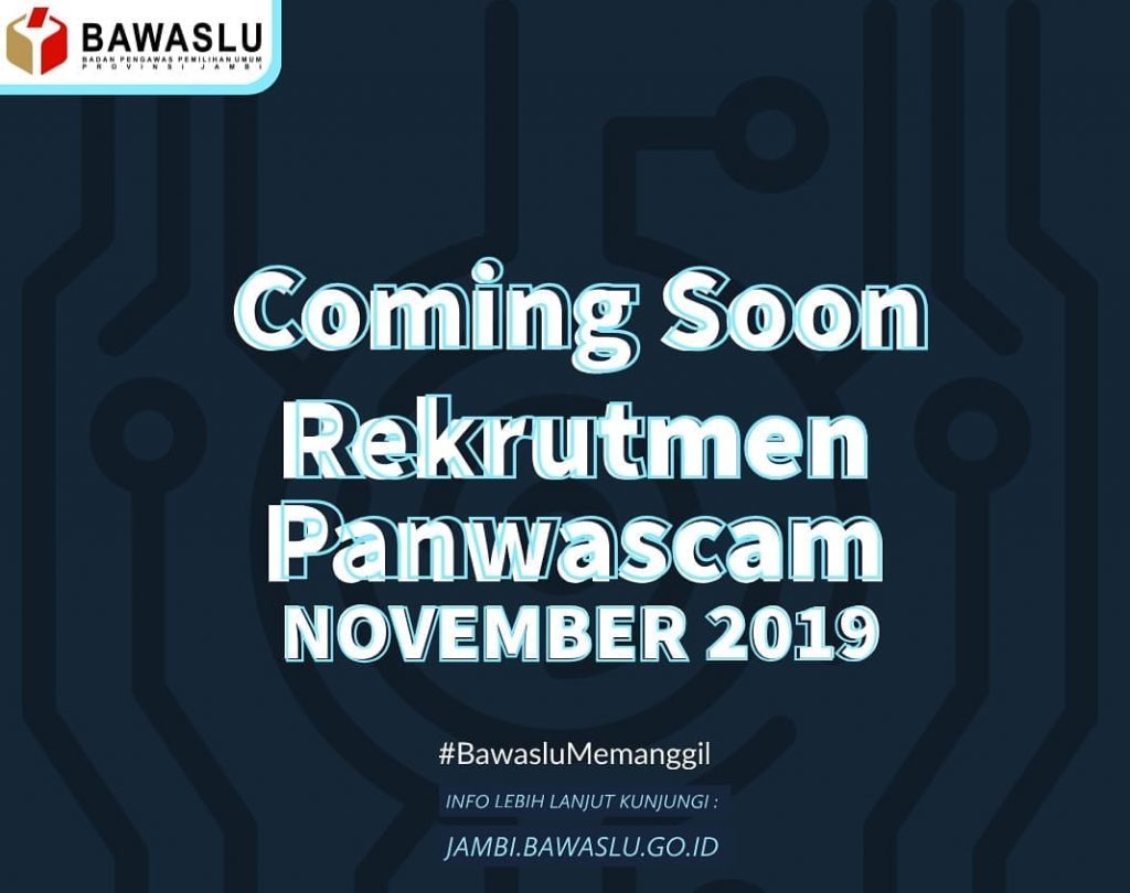Berikut pengumuman dan lampiran persyaratan perekrutan Panitia Pengawas Pemilihan Kecamatan se-Provinsi Jambi tahun 2019, dalam rangka pengawasan penyelenggaraan Pilkada serentak tahun 2020, silakan di KLIK LINK dibawah ini: