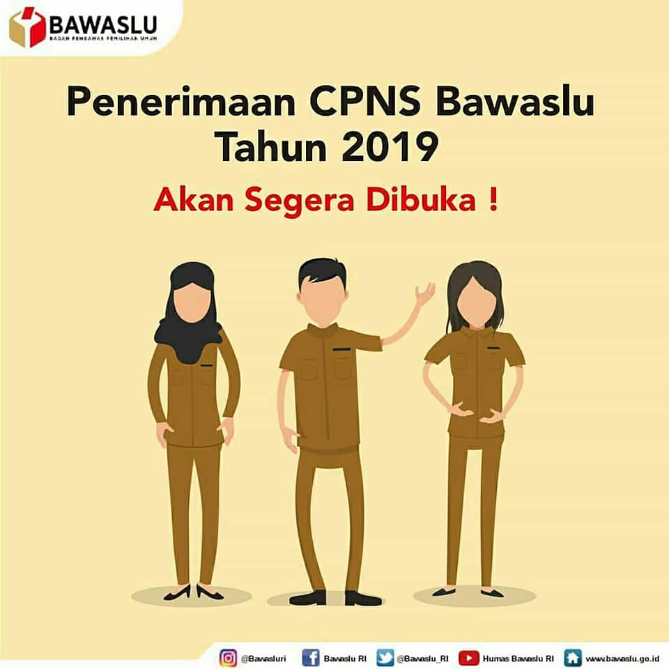 Badan Pengawas Pemilihan Umum berdasarkan Keputusan Menteri Pendayagunaan Aparatur Negara dan Reformasi Birokrasi Nomor 683 Tahun 2019 tentang Penetapan Kebutuhan Pegawai Aparatur Sipil Negara di Lingkungan Badan Pengawas Pemilihan Umum Tahun Anggaran 2019, membuka kesempatan kepada Warga Negara Indonesia putra-putri terbaik Indonesia lulusan Sarjana Strata 2 (S-2)/Sarjana Strata 1 (S-1)/Diploma IV (D-IV) untuk menjadi Calon Pegawai Negeri Sipil (CPNS) di Lingkungan Badan Pengawas Pemilihan Umum Tahun Anggaran 2019.